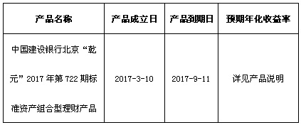 关于中国建设银行北京“乾元”2017年第722期标准资产组合型理财产品成立的公告