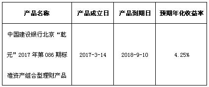 关于中国建设银行北京“乾元”2017年第086期标准资产组合型理财产品成立的公告