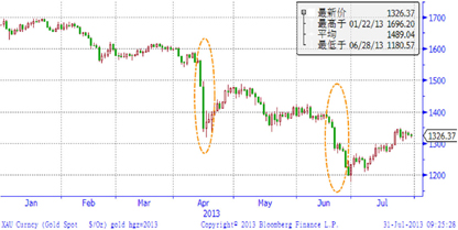 第三阶段:6月中旬起,以美联储调整货币政策为导火线,黄金市场开启新一轮跌势,随后又在实需和技术买盘推动下逐步收复失地,走势呈V型。620,美联储发表声明,退出QE预期确立,金价单日跌幅5%。新一轮下跌的驱动因素在于新兴市场出现不利波动,股市、债市和汇市均表现疲软,资金回流美国推升美元指数,黄金承压,一度跌破1200美元/盎司重要支撑线。进入7月以来,受实需提振及空头回补买盘驱动,加之日本货币宽松预期升温和欧元区经济好转影响,金价超跌反弹,截至730收报1328.10美元/盎司。
