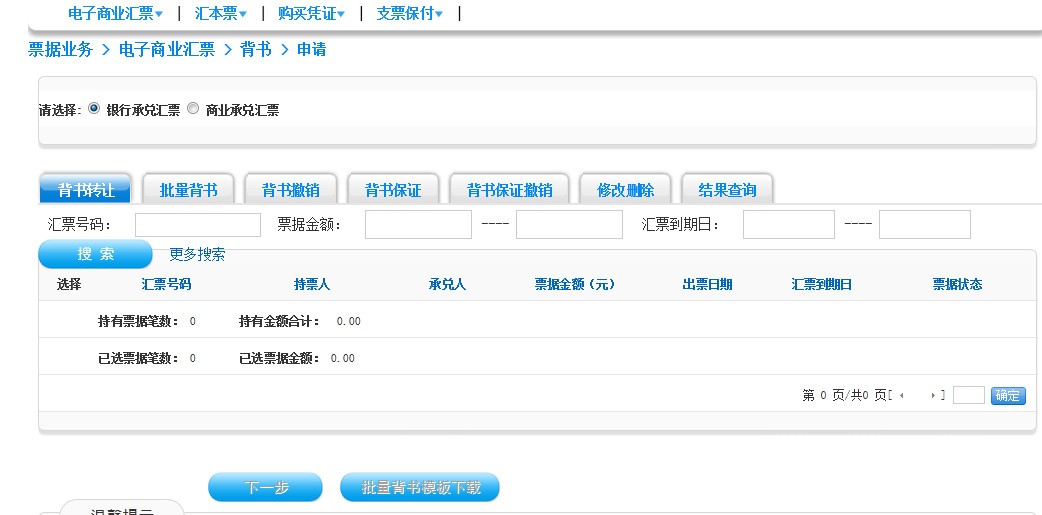(3)背书:是指持票人将电子商业汇票权利依法转让给他人的票据行为。制单员点击“票据业务-电子商业汇票-背书-申请”制单,然后按照票据流程进行复核。提交后,票据状态为“背书待签收”。对方签收票据后,票据状态为“背书已签收”。