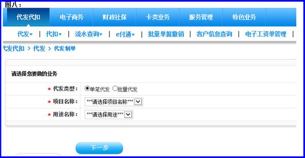 点击“代发代扣→代发→代发制单”,选择“单笔代发”、“项目名称”、“用途名称,点击“下一步”,进入单笔代发操作界面。