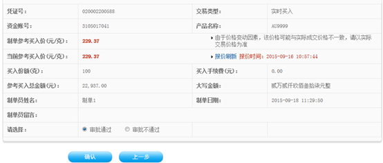 1.制单员登录企业网上银行,选择“投资理财→贵金属→黄金积存-黄金积存交易-实时买入”,输入份额,点击“下一步”。