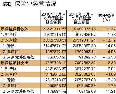 本季度各险种保费收入均有所下滑,2010年6月~8月(截稿时官方数据仅更新至2010年8月,因此选取2010年6月~8月这三个月作为一个统计季度)保险业保费收入较上一个季度下降10.32%,下降幅度较大。不过,本季度原保险赔付支出却略有增长,增幅为2.30%。(表4)
