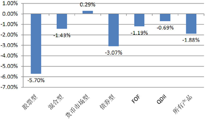 业绩表现:除货币市场基金外,其余类型基金均下跌