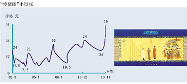 另外,今2013年发行的“母亲节”和“金铜佛造像”小版张也出人意料地分别大涨至45.5元和28元,而“景泰蓝”、“雷锋题词50年”、“桃花”、“中国古镇”和“琴棋书画”小版张则分别盘旋在15.8元、21元、23.5元、18.5元和25.5元附近,前些年发行的“梅兰竹菊”、“福禄寿喜”、“红色足迹”、“关公”和“行书”小版张分别上攀到36.5元、46元、23元、36元和82元,“资本市场”、“丝绸之路”、“草书”、“古代书院(2)”和“楷书”小版张分别回升至50元、15元、49元、16元和31元。