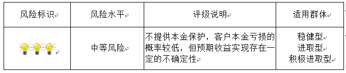 本期产品内部风险评级级别为三盏警示灯 ,风险程度属于中等风险。产品适合于稳健型、进取型及积极进取型客户。最不利情况下,基础资产无法回收任何本金和收益,客户将损失全部本金。客户不得使用贷款、发行债券等筹集的非自有资金投资本产品。